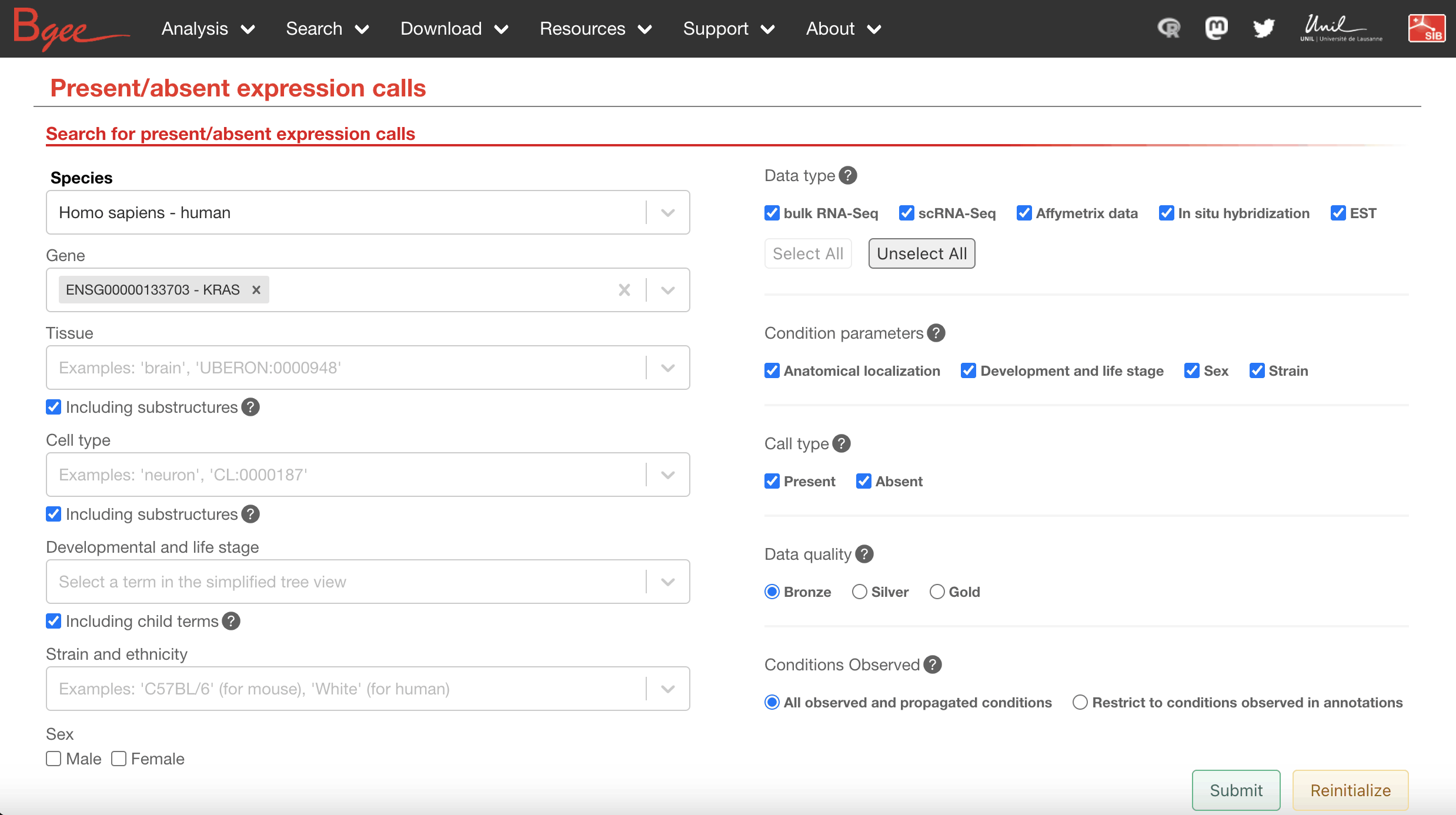 Search the present and absent expression calls in the Bgee database. Learn how to search for expression calls in your species, genes, tissues, cells, developmental stages, sexes, and expression data types of interest.